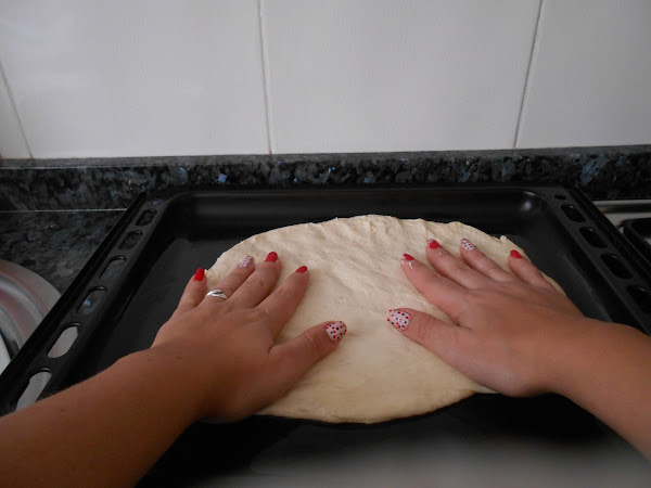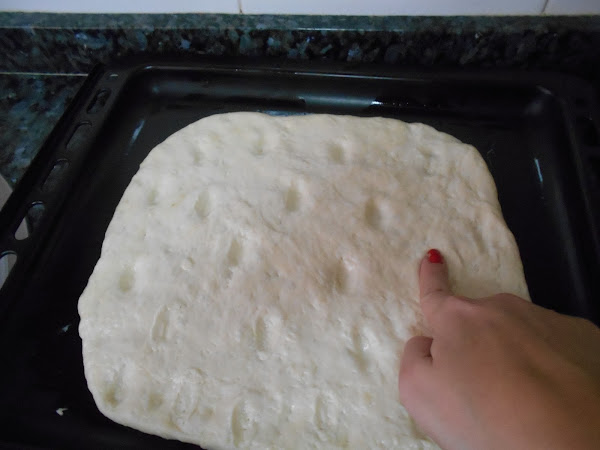 Extendemos en una bandeja de horno engrasada con aceite y dejamos levar de nuevo.