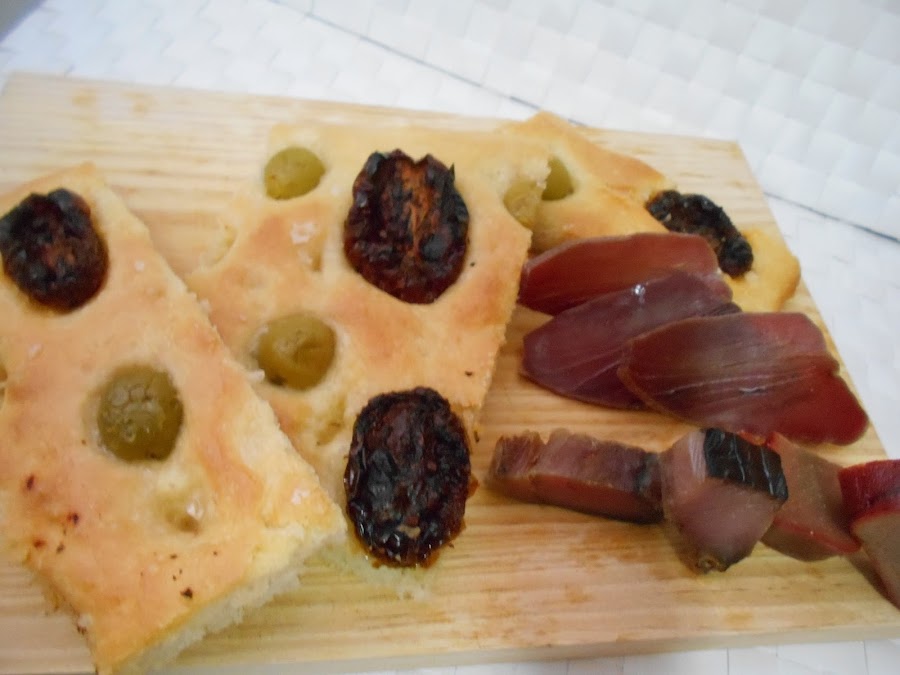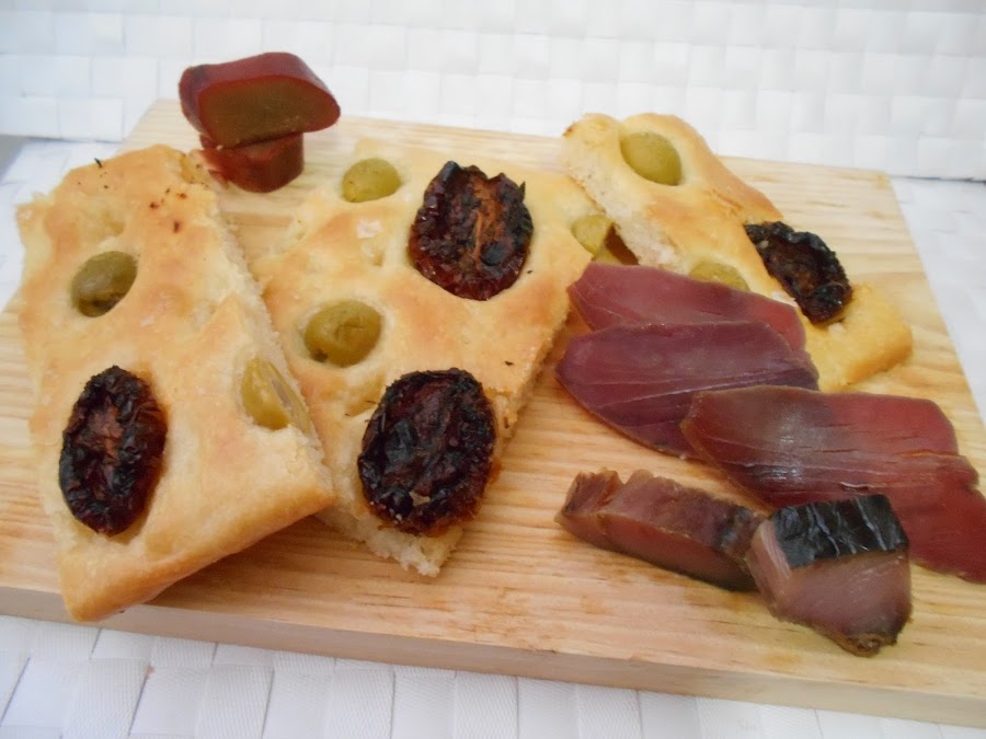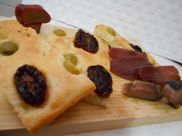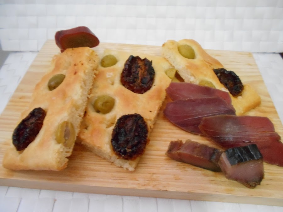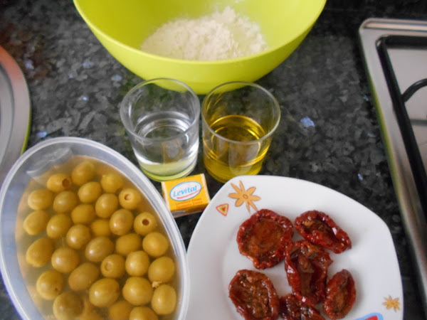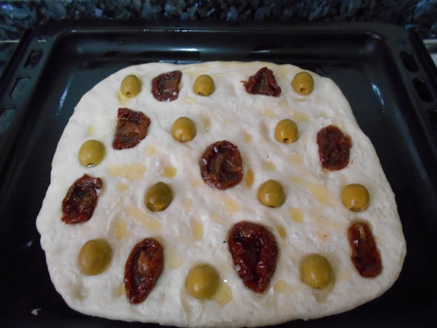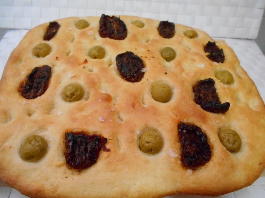 La primera vez que la hice se me ocurrio porque tenia unos cuantos tomates secos caseros y pense en hacer algo con ellos y dandole vueltas dije... en una masa de pan con unas olivitas... tiene que estar muy rico. Y efectivamente asi es.
