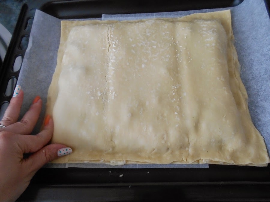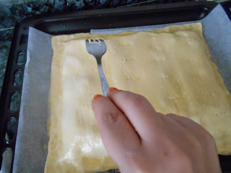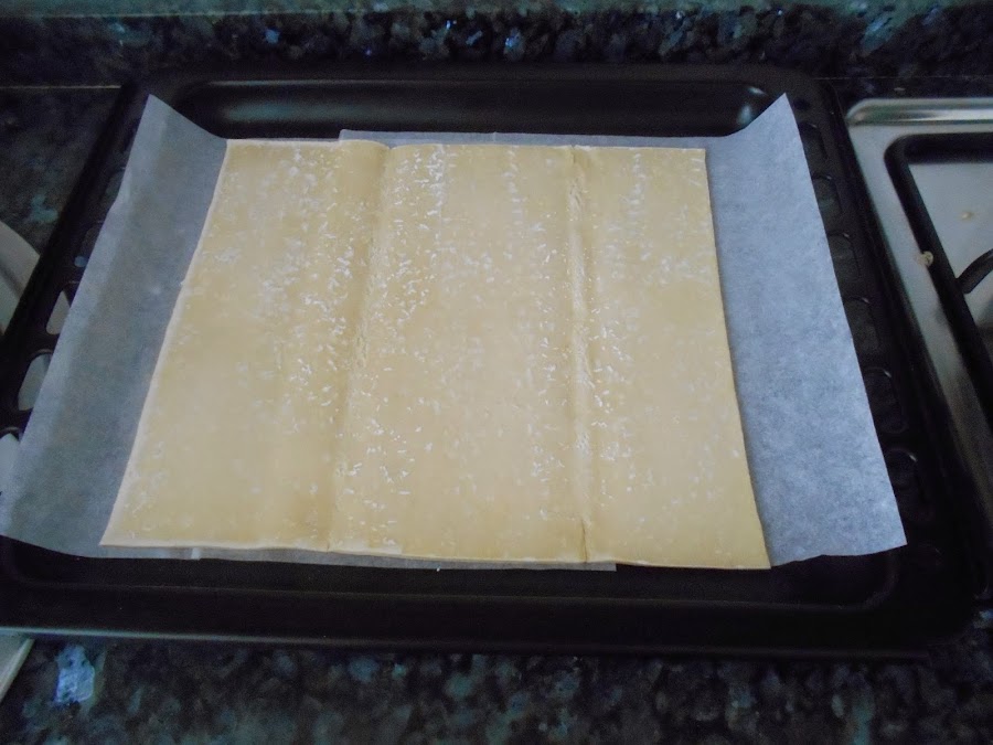 Extendemos una lamina de hojaldre en la bandeja con papel de hornear (yo he usado el mismo papel que trae el envase)