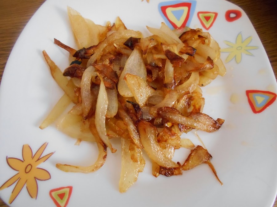 Cortamos la cebolla en juliana y sofreimos en una ollita con aceite. Reservamos.