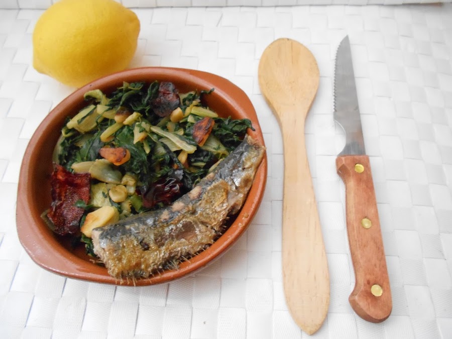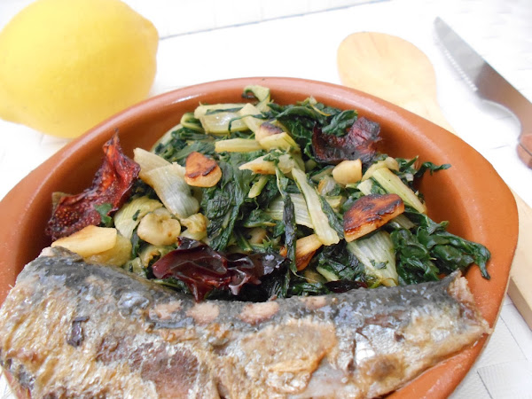 La sardina se pone en el plato para acompañar a las acelgas fritas.