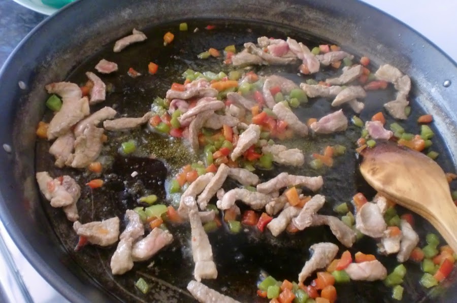 Echamos el arroz y rehogamos ligeramente y sazonamos