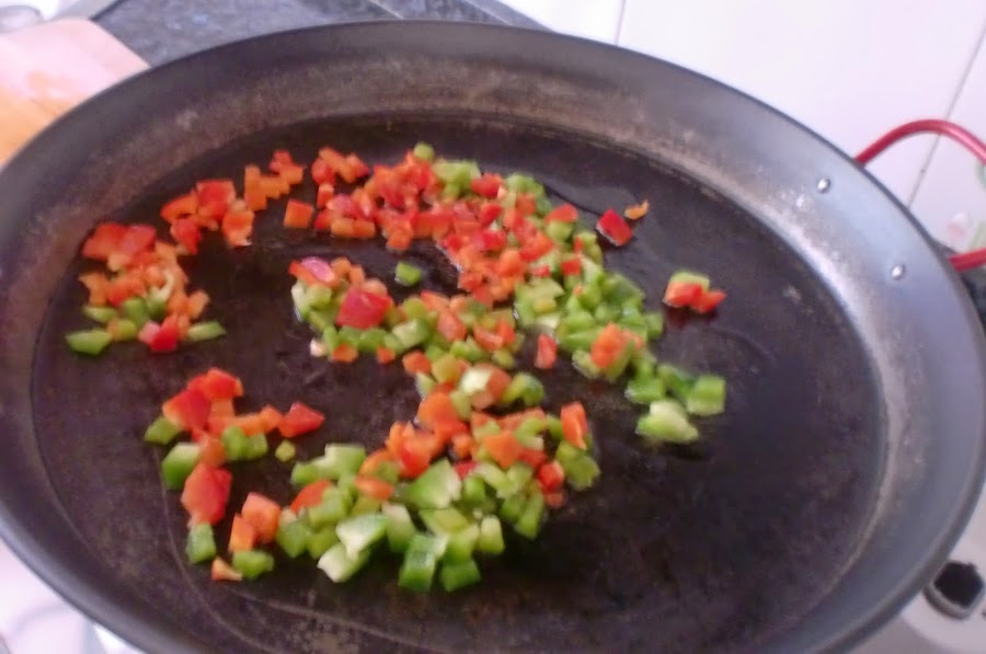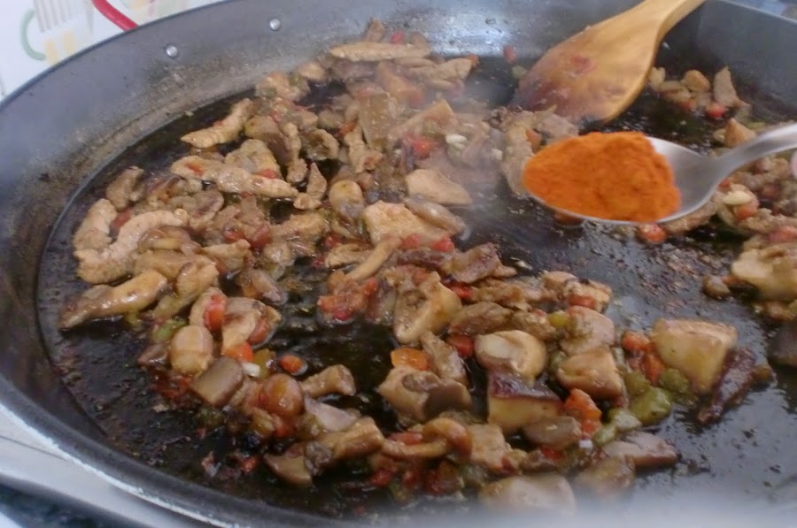 Añadimos el pimenton, el azafran, la salmorreta y el tomate.