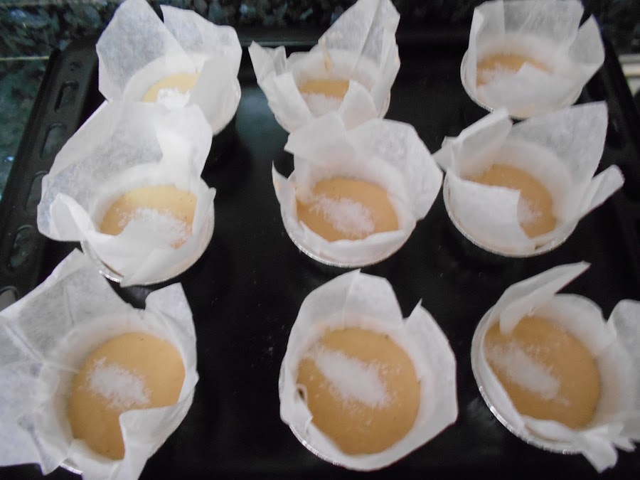 Vertemos la mezcla en las capsulas, que como os decia he hecho yo misma para que tuvieran un aspecto más rustico.