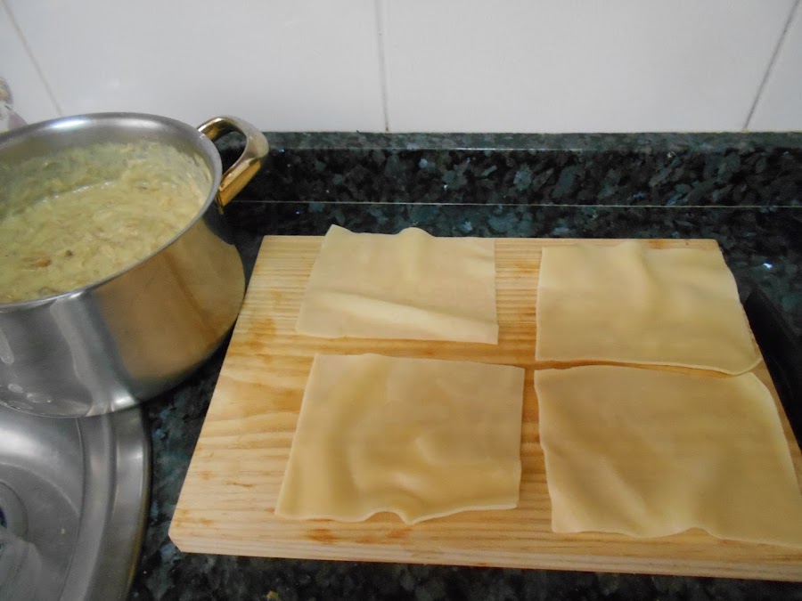 Ponemos a cocer las laminas de canelon. Y nos disponemos a montar los canelones