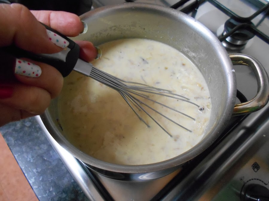 Vamos añadiendo leche poco a poco hasta lograr una consistencia de bechamel densa.