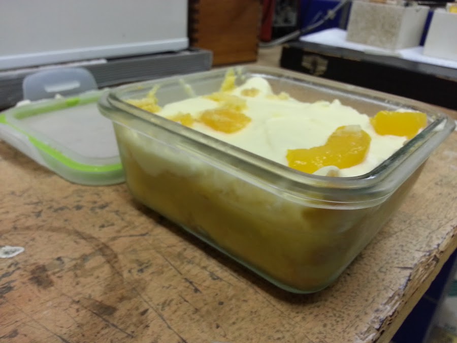 En el momento en que termine, verter sobre las capas de queque, frutas, queque; y dejar enfriar.