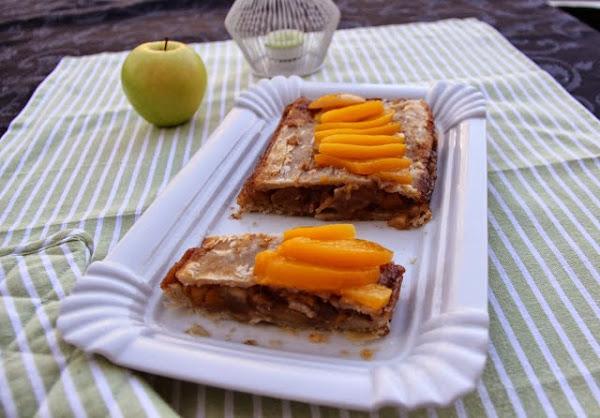 Esta tarta se hace como no, con hojaldre, melocotones en almíbar, manzana, canela, azúcar, uvas pasas y clavo. Lo bueno de esta tarta que es se prepara rápido ya que si tenemos la lata y una manzana, no tenemos que comprar mucho más.