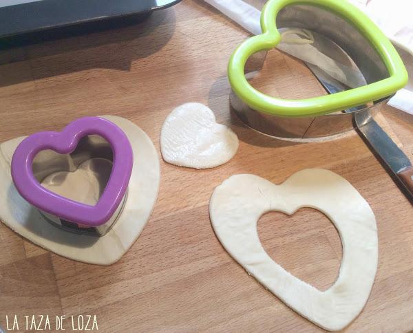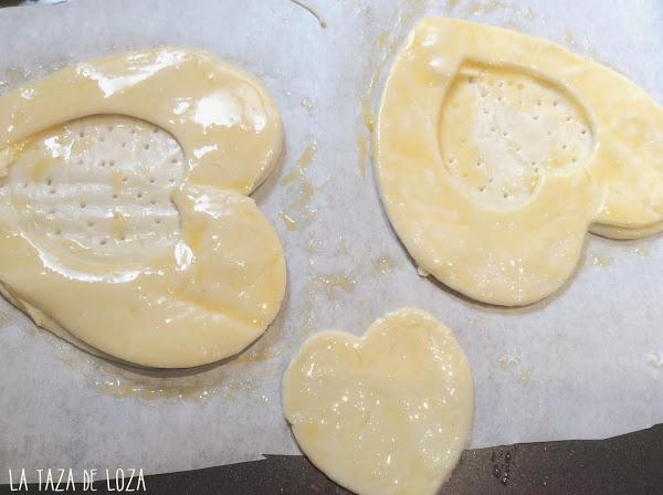 Los corazones pequeños, sobrantes de cortar el centro de la masa, también los he horneado para decorar el plato final.