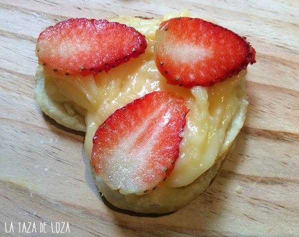 En esta fotografía inferior ya están rellenos con la crema pastelera y las fresas laminadas. En el enlace os he dejado mi crema casera de una receta mía anterior "Canutillos rellenos de Crema Pastelera" .