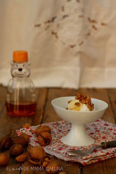 Una combinación muy clásica y tradicional, pero no menos deliciosa. Añadimos unas nueces troceadas sobre el helado y un chorro de miel, para completar el postre, uhmmmm!!!