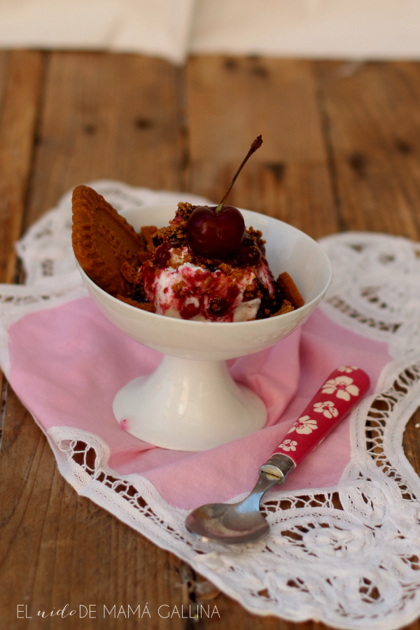 De esta forma queda precioso y riquísimo, como un helado de las películas americanas. Le he añadido una cucharada de mermelada de cerezas y galleta troceada por encima, es una mezcla deliciosa. También puedes cambiar el sabor de la mermelada por el que más te guste.