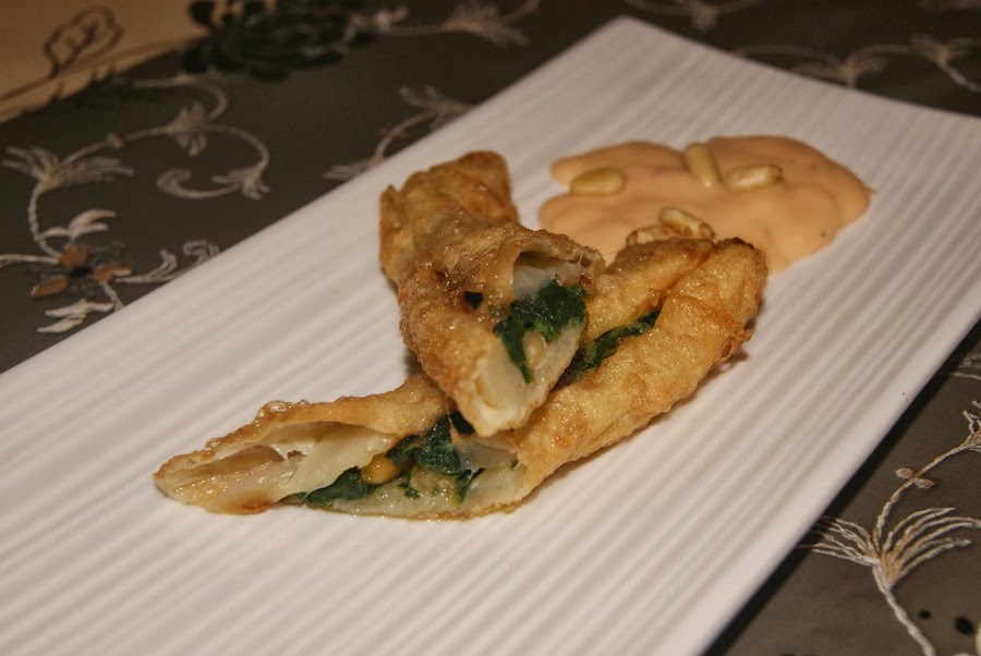 Esparragos rellenos de espinacas, piñones y bechamel de langostinos