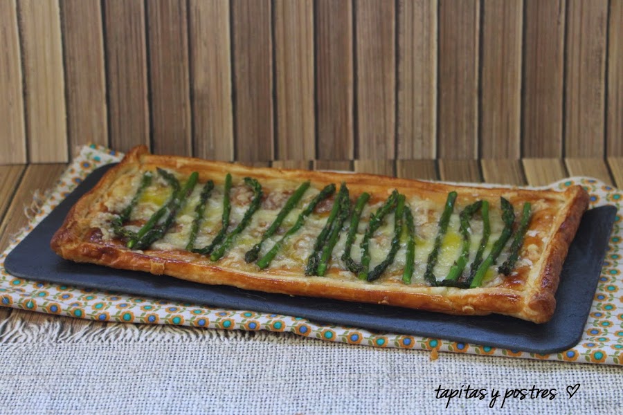Esta receta me encanta por sencilla y sabrosa. Con pocos ingredientes y sencilla elaboración. En una lámina de hojaldre -previamente pintada con huevo batido-ponemos los espárragos y queso gruyere, horneamos y añadimos aceite y sal. Receta detallada en el blog: Tapitas y postres