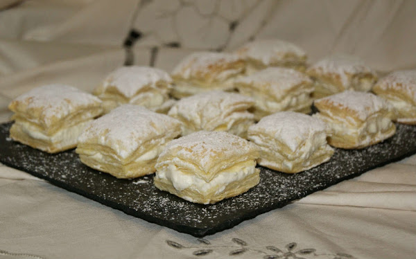 En la cocina de Ana, tenemos esta receta super sencilla y muy económica. Con solo tres ingredientes podemos disfrutar de un rico bocado de hojaldre y nata (crema de leche): 1 lamina de hojaldre, nata (crema de leche) y azúcar. Sólo tenemos que estirar la masa, cortarla. Después la horneamos y rellenamos con la nata (crema de leche). Decoramos con azúcar glas. para ver todos los detalles: (Aquí)Milhojas rellenas