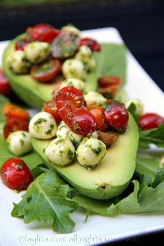 En un recipiente mezcle los tomates, las bolitas de queso y la salsa de albahaca. Aparte, coloca las mitades de los aguacates y agrega un poco de limón para que no se oscurezcan. Añade sobre el aguacate 1 hoja de lechuga o puede ser lechuga picada. Rellena los aguacates con la mezcla de tomate y queso y rocía con un poco de vinagre balsámico. ¡Sirve inmediatamente! y a disfrutar.
