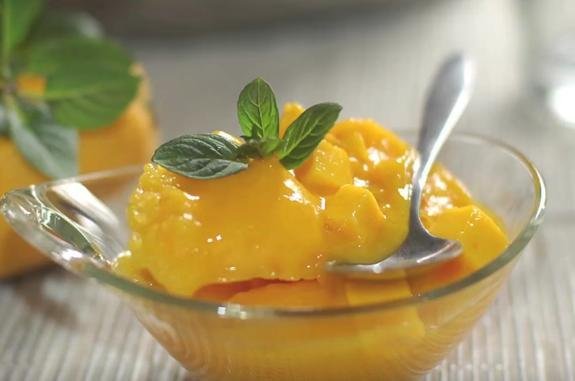 Esta receta es muy fácil y rápida. Solo necesitas dos mangos, almíbar (azúcar y agua a partes iguales) y una pizca de sal. Vídeos de cocina al natural ha decorado el sorbete con menta, aunque puedes usar cualquier tipo de hierba aromática e incluso trocitos de frutas.