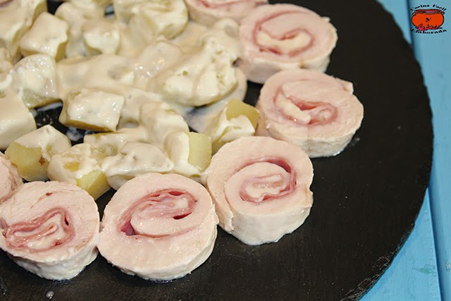 De mi web, unas pechugas de pollo rellenas de jamón y queso. Además acompañadas con unas patatas en salsa de nata (crema de leche) y roquefort. Ya con la explicación está casi todo dicho,jeje. Pollo con salsa barbacoa casera y fácil