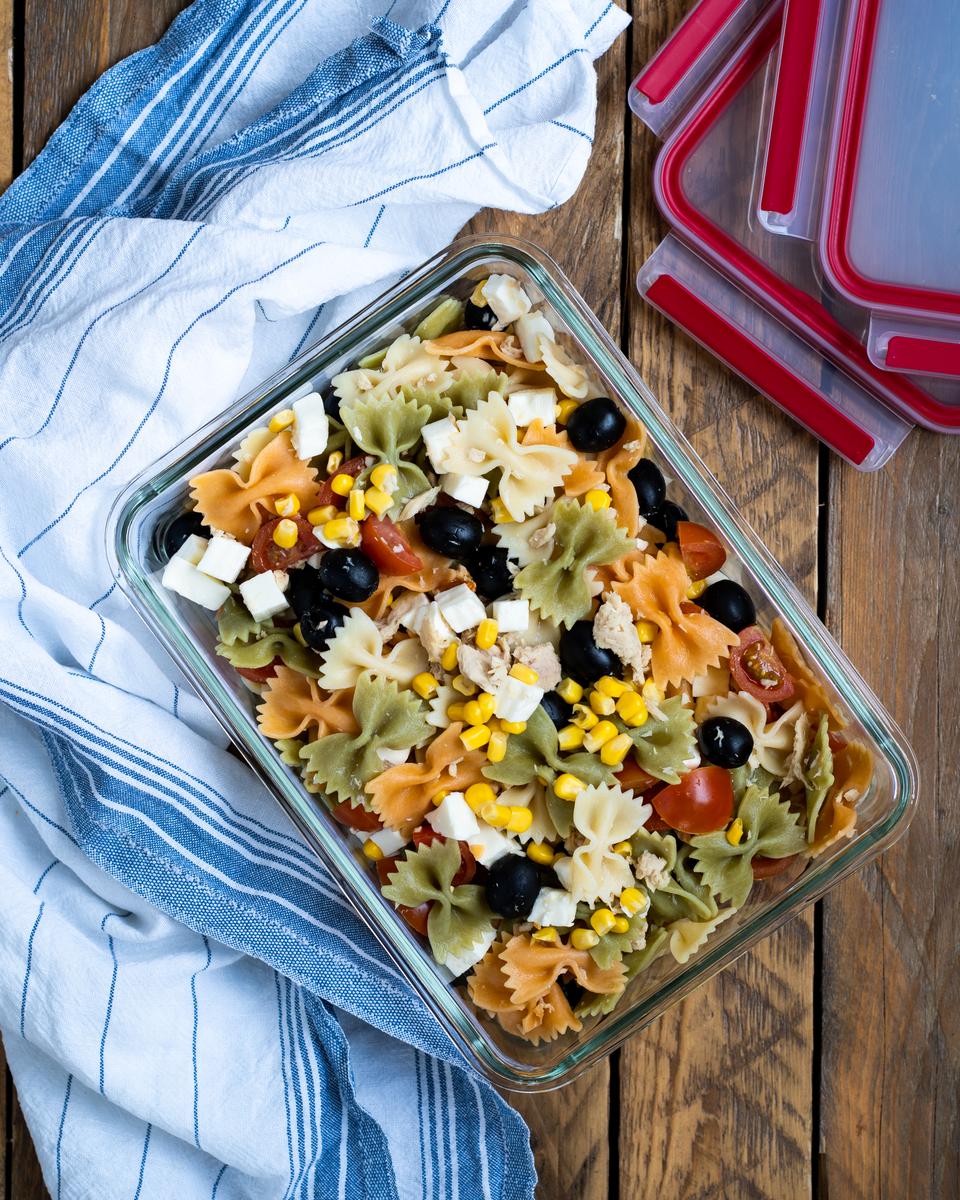 Poner la pasta escurrida y pasada por agua fría en un recipiente hermético, sobre ella el maíz, el queso de burgos en dados, las aceitunas negras cortadas por la mitad, cherries cortados y el atún escurrido, remover y guardar