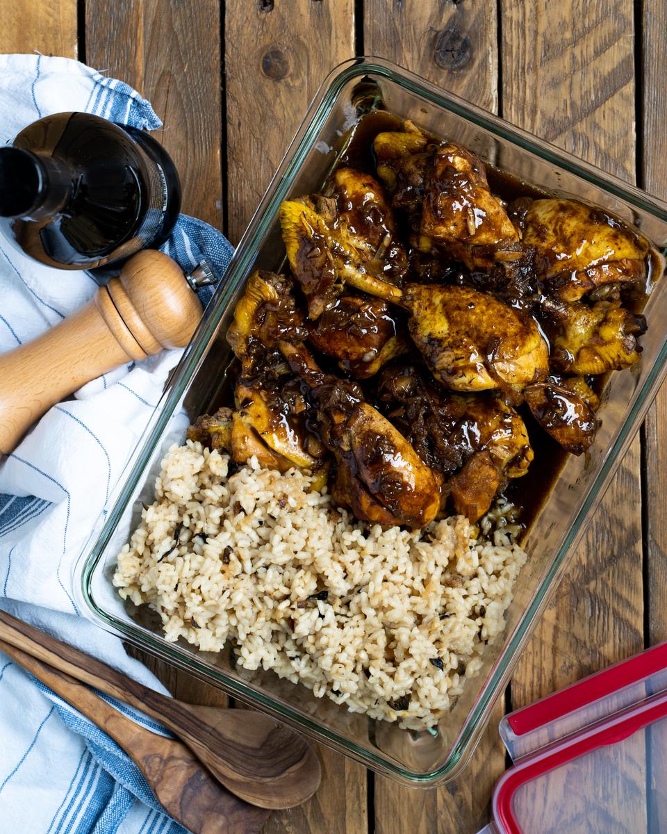MUSLOS DE POLLO EN VINAGRE BALSÁMICO CON ARROZ