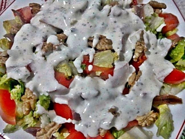 Otro entrante igual de saludable y sabroso es esta ensalada de La Dulzura de Mari, que se prepara con lechuga, tomate, anchoas, nueces,yogur, queso crema y especias. Primero realizamos la salsa mezclando el yogur con el queso y las especias, y a continuación colocamos el resto de ingredientes picados en una fuente.Al momento de servir le agregas la salsa encima del plato. Este es un platillo muy rico y sobre todo ligero