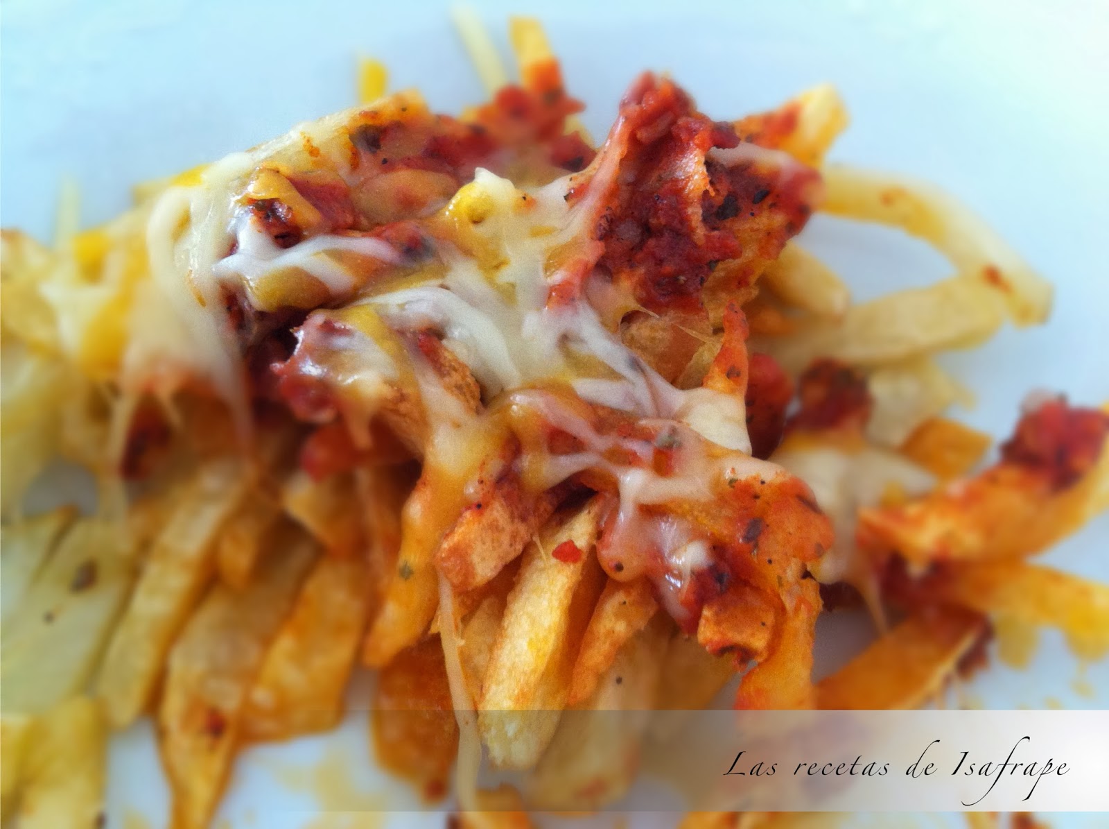 A ver que os parece lo que os propongo desde mi blog; patatas fritas a las que se le añaden bacon cocinado y especiado mezclado con tomate triturado. Una vez mezcladas las patatas con el tomate y el bacon, se le espolvorea queso para fundir y dejamos que se funda sobre las patatas con una técnica que os enseño en la receta. Suena sugerente ¿verdad?