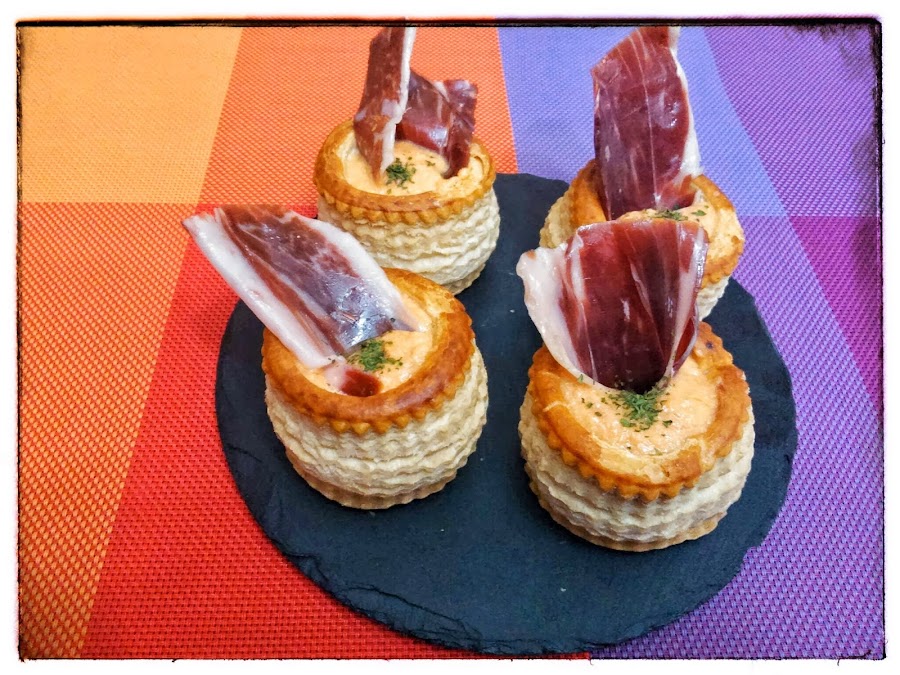 Cazuelas de hojaldre, jamón y gazpacho