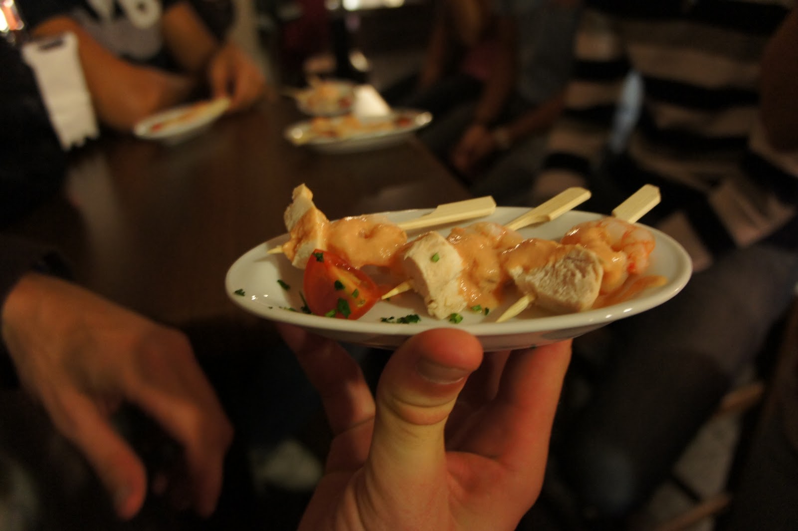 Para finalizar la noche bajamos a la calle Teofilo Llorente, a una nueva tapería llamada SETEMBRO y que presentaba a concurso una tapa con el mismo nombre del local. Se trata de 3 mini-broquetas de gambas y pollo con salsa rosa, una tapa que no tenía mucho sabor e igual le faltaba algún tipo de adobo o especia, o una salsa rosa más elaborada.