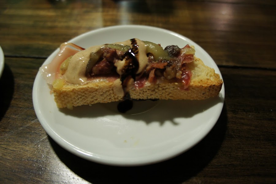 Empezamos nuestro recorrido por la tapería SE FINÍ (Rua Real 10) que competía con su “Alboroto de sabores”, una tosta con una combinación de jamón de bellota, manzana al brandi y fuet entre otros ingredientes. Para mi una tapa deliciosa, la combinación de sabores era exquisita. Altamente recomendable.