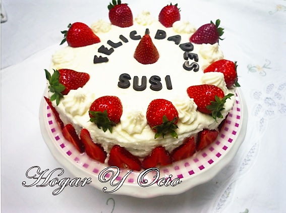 Lo remojamos con un almíbar hecho con agua y azúcar y lo rellenamos con mermelada de fresas. Lo cubrimos con nata montada (crema de leche) y lo adornamos con fresas frescas...¡¡una gozada que podéis ver en el blog Hogar y Ocio!!