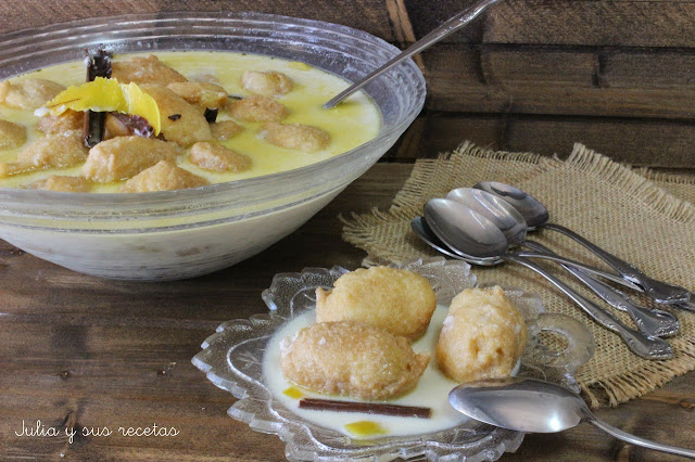 Son muy sencillos, tendremos que mezclar el an con los huevos batidos, hacer los panecillos y freírlos. Luegos los cocemos en leche con canela...