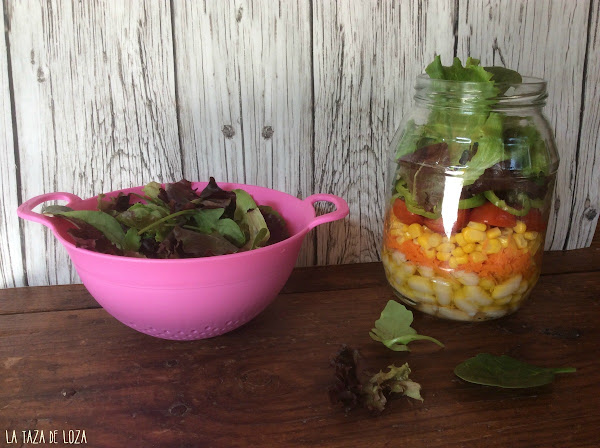 Es decir, lo primero es el aliño, luego en este caso la base de judías blancas (yo las saco del tarro donde las compro y las lavo en un colador bajo el grifo para enjuagarlas bien, luego se pone la zanahoria rallada, el maíz, tomates cherry o más grandes y cortados pequeños, el pimiento verde cortado a rodajas superfinas, por último las hojas verdes y el día del consumo o le ponéis algún ingrediente más o nada más, ya que así esta deliciosa. Antes de abrir el frasco, darle la vuelta para que el aliño impregne bien toda la ensalada, abrir y poner lo que ese día más os apetezca.
