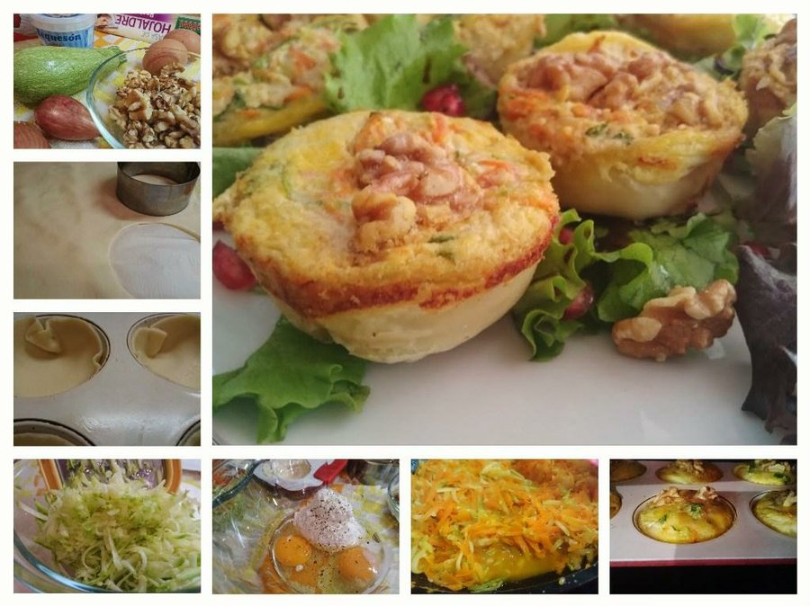 Tenemos que tener una lamina de hojaldre, zanahoria, nueces, huevos, calabacín y queso entre los ingredientes principales. Rallamos las verduras, las cocinamos unos minutos en una sartén con un poco de aceite de oliva. Estiramos la lamina en círculos, engrasamos unos molde y los cubrimos con los círculos. Mezclamos la verduras cocinadas con los huevo y las nueces. Rellenamos el hojaldre con las verduras y cocinamos 25 o 35 minutos en el horno. Para ver la receta completa: (Aquí)