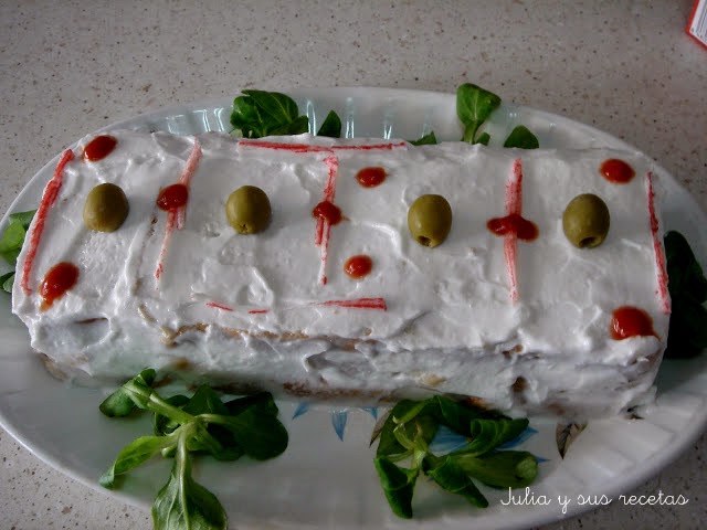 Mojaremos el pan en la leche y lo pondremos en un plato, mezclaremos el resto de ingredientes picado e iremos poniendo capas de pan y del resto de ingredientes hasta formar el pastel. Lo cubrimos con mayonesa y adornamos al gusto. Lo servimos fresquito.