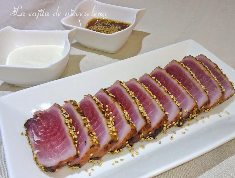 Tataki de atún con ajo blanco, una receta de La cajita de Nieves y Elena: