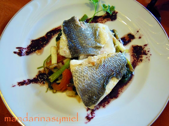 Lubina horneada con verduras y salsa de garnacha, una receta de Mandarinas y miel: