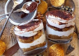 Remojaremos los bizcochos en el almíbar de café y pondremos en el fondo del vasitos, luego haremos la crema con el mascarpone, y la nata (crema de leche) y pondremos una capa encima de los bizcochos, otra capa de bizcochos, otra de crema y los espolvoreamos con cacao en polvo... deliciosos!!