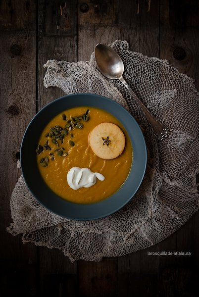 1- CREMA DE CALABAZA Y MANZANAUna crema suave y delicada, la mezcla de calabaza zanahoria y manzana le dan un punto dulzón que yo balanceo con una cucharada de iogurt natural como acompañamiento.