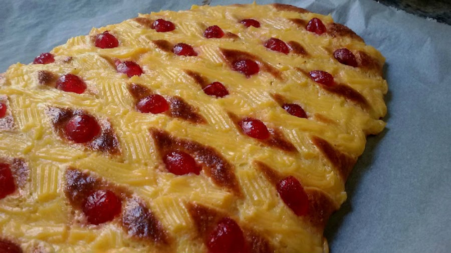 COCA DE CREMA Y CEREZAS CONFITADAS.