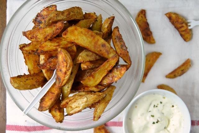 Y, para acabar, os traigo esta otra receta riquísima y muy sencilla que hace poco he reeditado en mi blog. Para hacerlas solo hace falta cortar las patatas en gajos con la piel y luego rebozarlas en especias. Asamos al horno y las acompañamos con un salsa hecha con mayonesa y queso crema ¡Seguro que os encantan! ¡Ya me contareis!