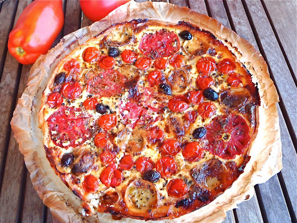 Para hacerla cubrimos un molde para quiche con una lamina de pasta brisa. Repartimos los tomates y el queso de cabra a trozo y luego cubrimos todo con una mezcla de huevos y leche y nata (crema de leche). Si quieres ver todos los detalles de la receta pulsa sobre el titulo y te llevará a la receta completa.