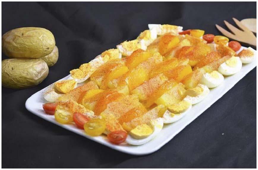 Típica ensalada de patatas y huevo duro con pimentón y, atención, ¡naranjas! Si, si, tal como lo ves. Verás que bien le queda.