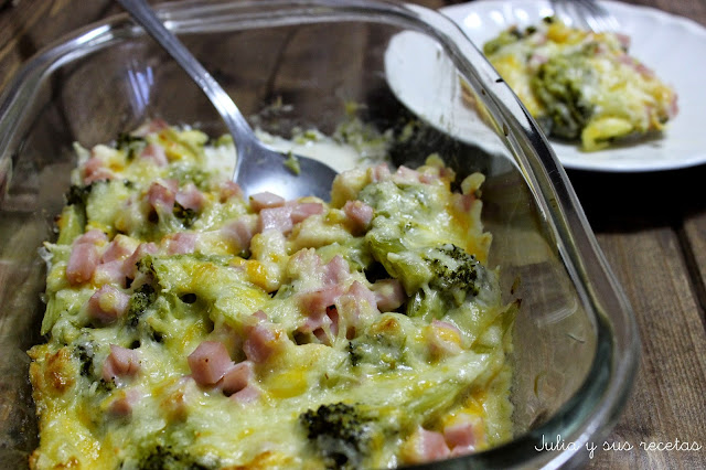 Los ingredientes para preparar este gratinado tan rico son: brócoli, jamón de york, nata (crema de leche) líquida, queso y especies, solo tenemos que hervir el brócoli al dente y bañarlo en una salsa preparado con el resto de ingredientes, luego gratinamos y listo. Muy sencillo y muy rápido, tienes que probarlo!