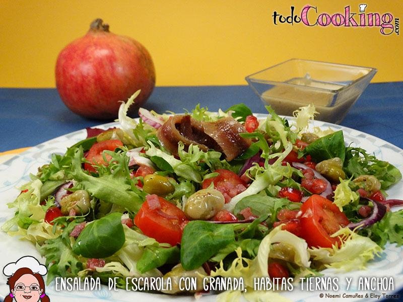 Ensalada de escarola, habitas frescas, granada y anchoas.