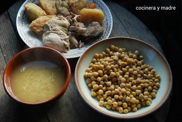 Otra receta de las de siempre, un plato único y contundente que encontraréis en mi blog Cocinera y madre, tan solo consiste en poner a cocer los garbanzos previamente remojados con todos los ingredientes, las carnes variadas y patatas y zanahorias en abundante agua y dejarlos hasta que estén bien cocidos y por supuesto acompañado de una buena sopa de fideos hecha con el caldo de cocción. Pero lo que hace a este cocido tan especial es las bolas de pan rallado cocidas hechas con pan, huevo, ajo y perejil y doradas en aceite, están buenísimas....si queréis ver como se preparan no dudes en entran pinchando en el enlace.