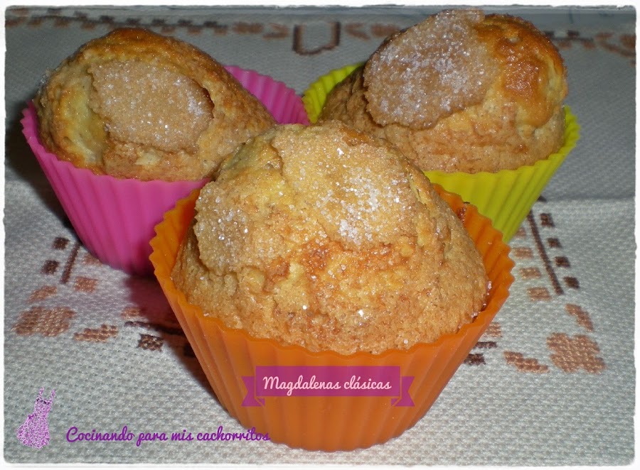 para desayunar y merendar Comienzo con la receta de las magdalenas clásicas, las que hemos hablado antes. El primer paso es batir bien los huevos con el azúcar, hasta hacerlos blanquear. A continuación se van añadiendo el resto de los ingredientes: aceite de oliva, harina, levadura y ralladura de naranja o de limón. Una vez incorporados todos los ingredientes, tenemos que continuar batiendo la mezcla durante unos 5 minutos. El objetivo: introducir aire en la mezcla. El truco para que salgan con un copete perfecto lo podéis averiguar pinchando aquí para ver la receta completa.