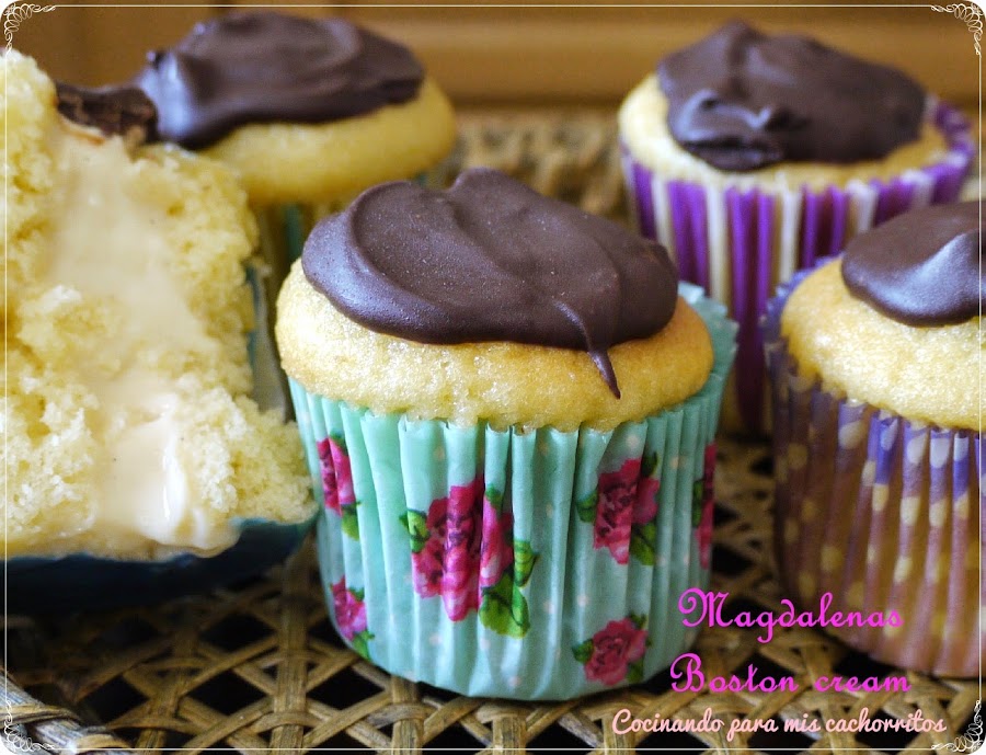 No quiero terminar esta selección sin recomendaros mis magdalenas favoritas: se hacen como las tradicionales, mezclcando huevos, harina, azúcar, leche y levadura. La peculiaridad es que, después de hornearlas, se rellenan de crema pastelera y se coronan con un poco de chocolate fundido que después endurecerá. Como veréis, son tentadoras.