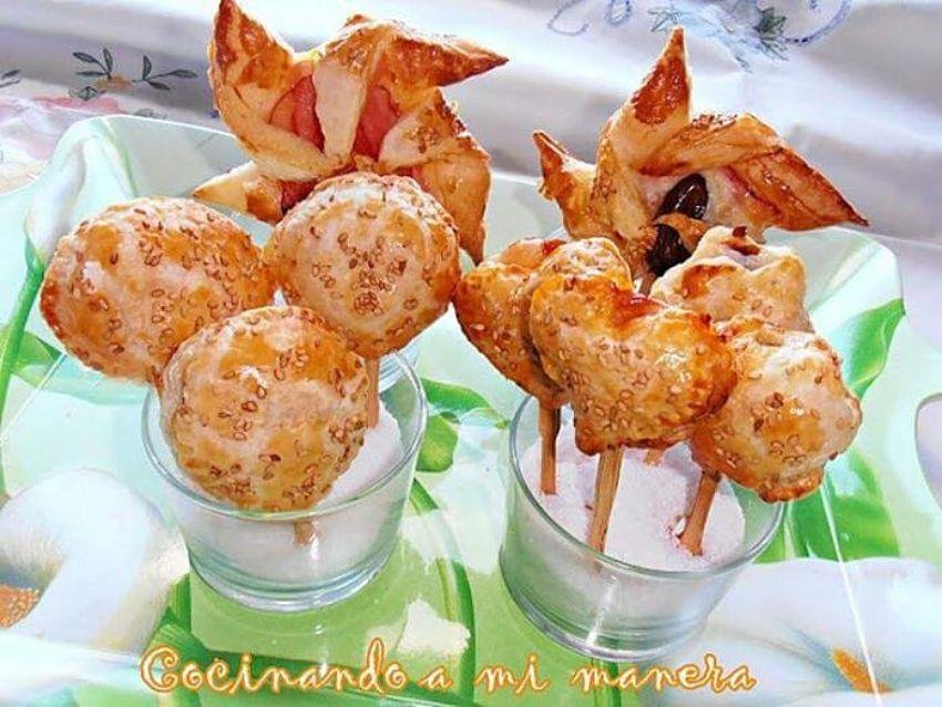 Carmen nos trae unos riquísimos aperitivos de hojaldre y queso con formas de piruletas, chupa-chups y molinillos. Sin duda que además de riquísimos van a ser muy divertidos y van a causar sensación. Para hacerlos vas a necesitar hojaldre, queso tierno, atún, tomate frito, bacon, jamón de york, dátiles deshuesados, un huevo para pintar la masa, sésamo y palitos. La preparación es muy sencilla, poco mas que darles forma, rellenar y hornear, los vamos a tener listos en poco tiempo y si quieres puedes VER LA RECETA AQUÍ