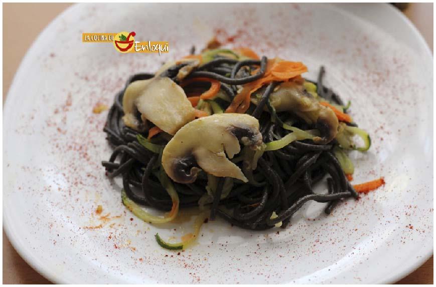Espagueti al nero di sepia con espagueti vegetales y champiñones