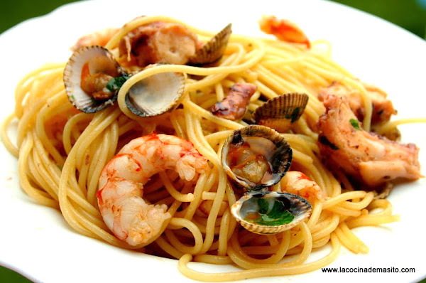 Espaguetis "frutti di mare", mejillones rellenos, almejas a la marinera, gambones al horno, langostinos al microondas y canelones de cangrejo.